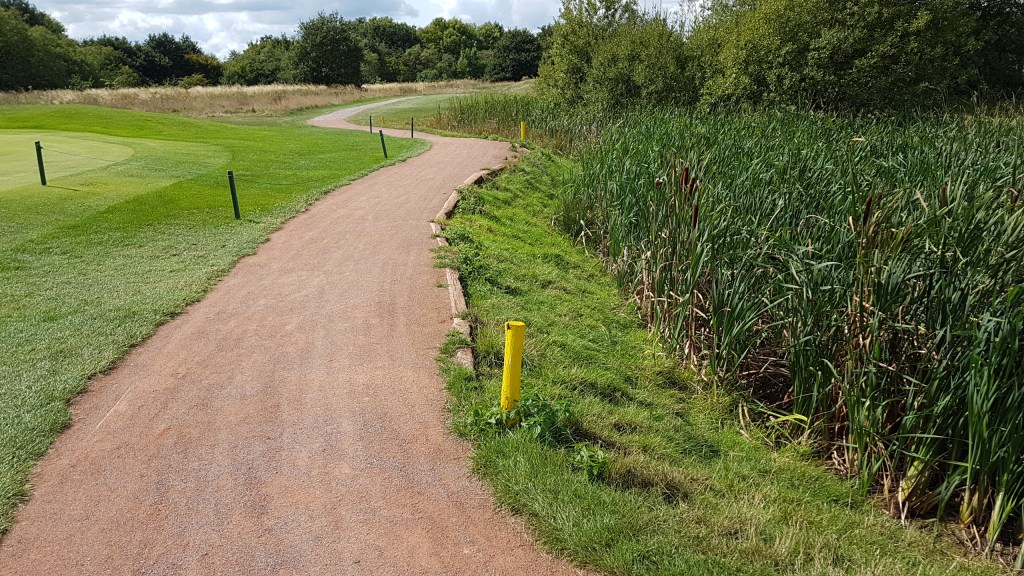 My view was that the markings otherwise followed the edge of the sleepers, which was also the “break in slope” around the pond, so this curved line was the edge of the Penalty Area. Part of the ball was therefore within said Penalty Area and so the player had to proceed under the Penalty Area Rule 17. This was not popular with the player’s father who argued that the ball was outside the line between the stakes and so there should have been free relief from the Immovable Obstruction.