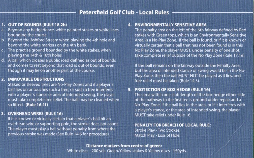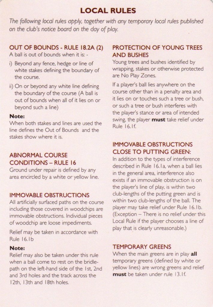 This is one of the first things a Rules Official will do before play starts. Understanding them is essential and they are different on every course. Knowing them can save you strokes by allowing you take relief. Not knowing them can cost you strokes – breaking a local rule normally incurs the General Penalty (2 strokes / loss of hole)