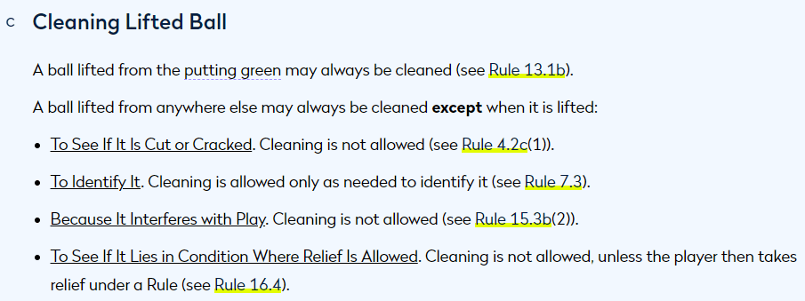 An error by the Rules Official? It is good practice for a Rules Official to tell a player not to clean their ball (at about 3:22 into the video) if they aren’t allowed to – trying to prevent an unnecessary penalty. However I think that JT would actually have been allowed to clean his ball before replacing it as it had been moved by an outside influence and had not been replaced on its original spot. If he had replaced the ball and then marked and lifted it to allow Rory to play he would not then have been allowed to clean it, so it is a very understandable mistake by the RO (I am also very happy to be corrected on this if I am mistaken). The times when a lifted ball may not be cleaned are listed in Rule 14.1c as follows: